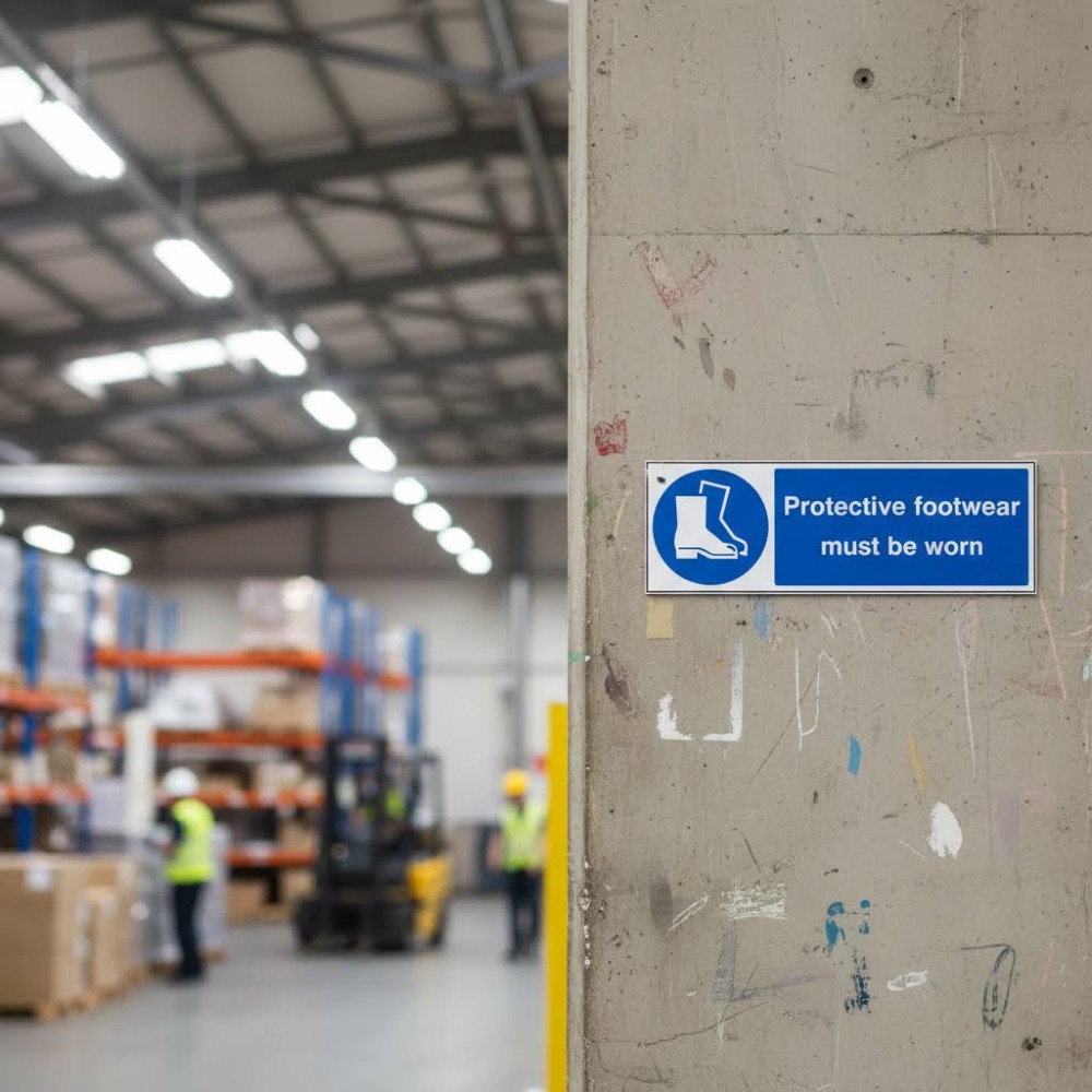 You'll typically find this sign at the entrances to construction sites, factories, warehouses, manufacturing plants, loading docks, and other industrial or high-risk work environments. Placing the sign at entry points helps remind workers, visitors, and contractors to wear the correct footwear before entering hazardous zones.