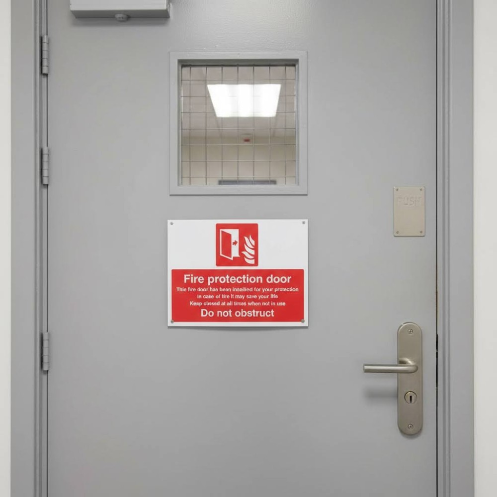 An important fire safety notice used to ensure that fire doors and the areas around them remain clear at all times. Fire protection doors are designed to contain smoke and flames during a fire, helping to prevent the spread of fire between different parts of a building. The sign reminds occupants and staff that these doors must not be blocked, wedged open, or obstructed in any way, as doing so can compromise the buildingôs fire safety system and put lives at risk.
