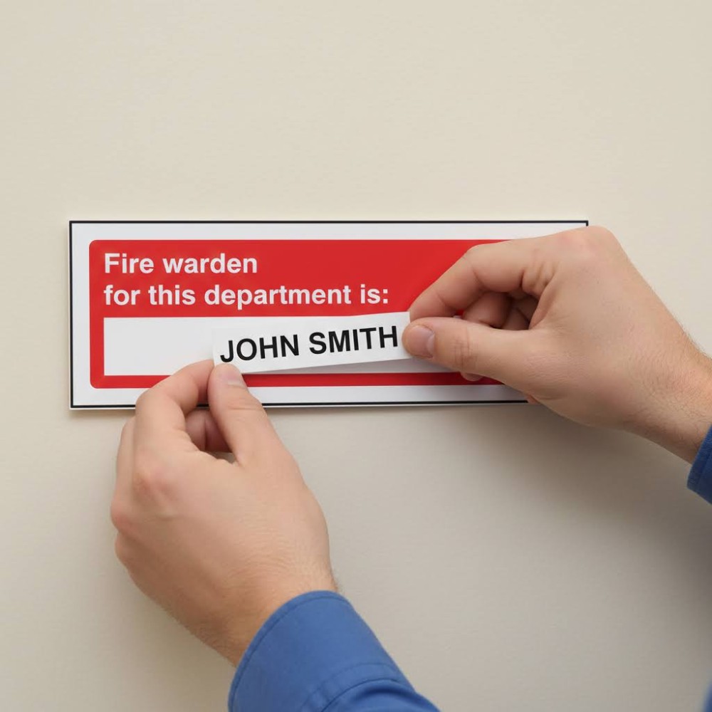used to clearly designate the person responsible for fire safety within a specific department or area. The blank space allows you to customise the sign by adding the name or title of the assigned fire warden, making it easy for staff and visitors to identify who to contact or follow during a fire emergency.