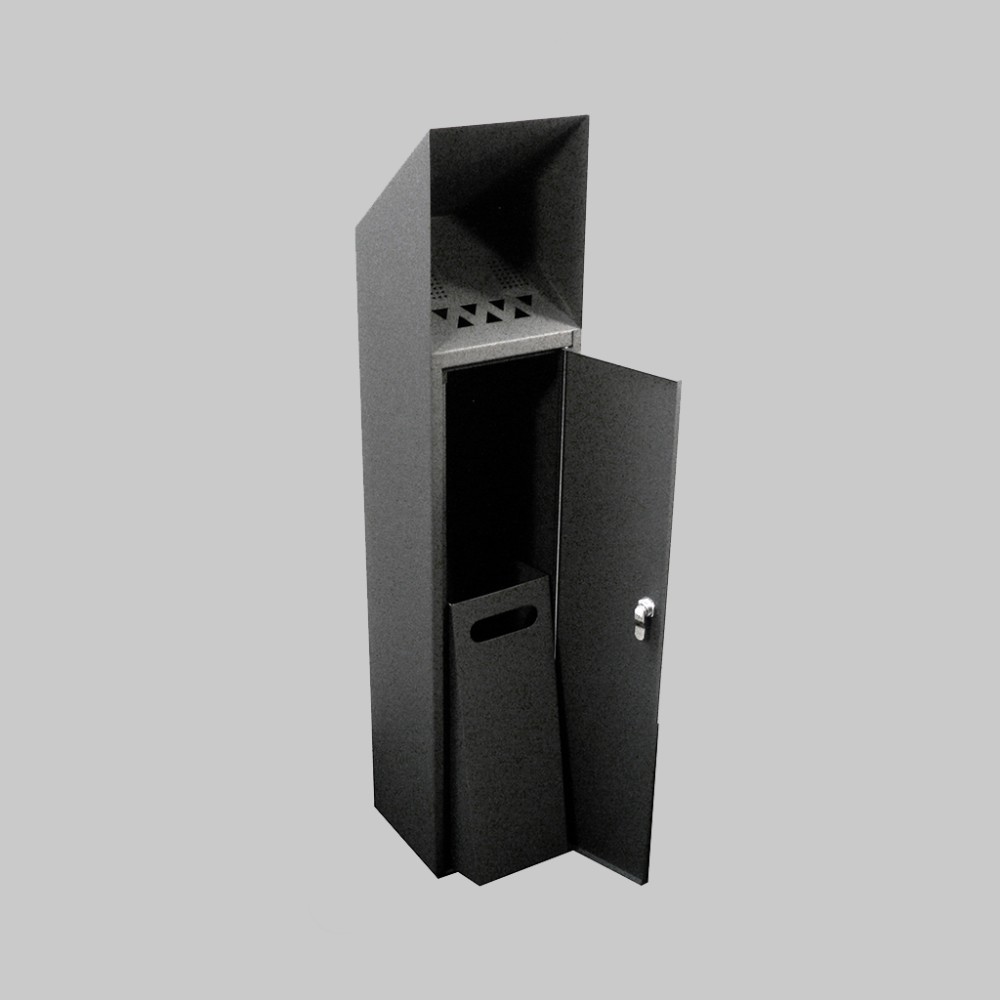 Keep smoking areas tidy and free from discarded cigarettes with this black powder coated wall mountable cigarette bin. A simple and convenient solution for ash and cigerette ends. The design includes a internal tray for quick and easy emptying. Installation kit and two keys are included 100 x..