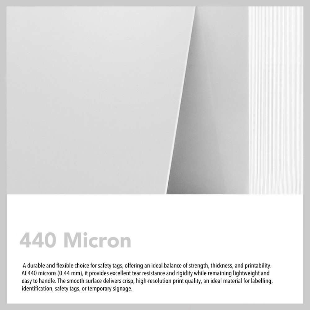 440 Micron PVC: A durable and flexible choice for safety tags, offering an ideal balance of strength, thickness, and printability. At 440 microns (0.44 mm), it provides excellent tear resistance and rigidity while remaining lightweight and easy to handle. The smooth surface delivers crisp, high-resolution print quality, an ideal material for labelling, identification, safety tags, or temporary signage.