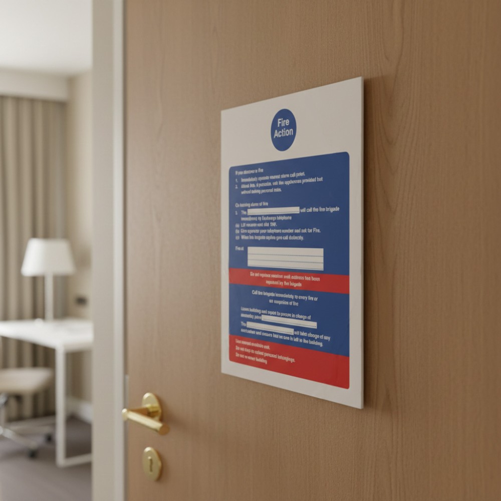 The sign helps reduce confusion and panic during a fire by offering straightforward, easy-to-follow steps. Clear guidance is crucial in emergencies where quick, calm action can save lives and minimise property damage. By prominently displaying these instructions, the sign ensures that even those unfamiliar with emergency procedures can act effectively.