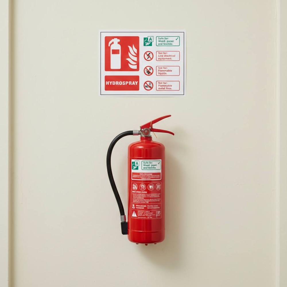 The sign should be installed directly above or next to the extinguisher, in visible areas where Class A fire risks are most common. Typical locations include offices, schools, hospitals, hotels, and public buildings, particularly in corridors, classrooms, storage rooms, and other places where materials like paper and fabric are present. In these settings, hydrospray extinguishers are effective and easy to operate in an emergency.