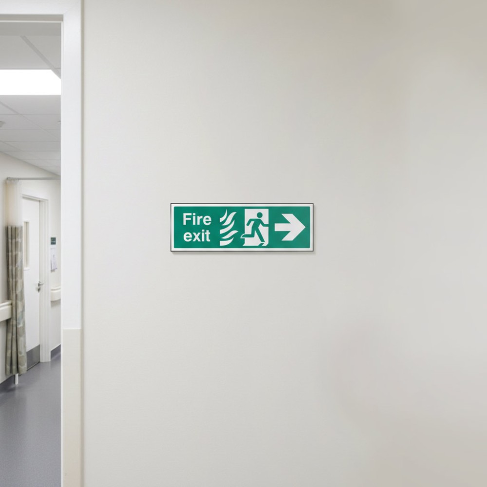This sign is commonly placed in hospitals, health centres, clinics, care homes, and other healthcare buildings, particularly along evacuation routes where individuals must turn right to reach a safe exit. You'll often see it in corridors, near doorways, and at intersections to maintain a continuous and easy-to-follow directional flow during emergencies.