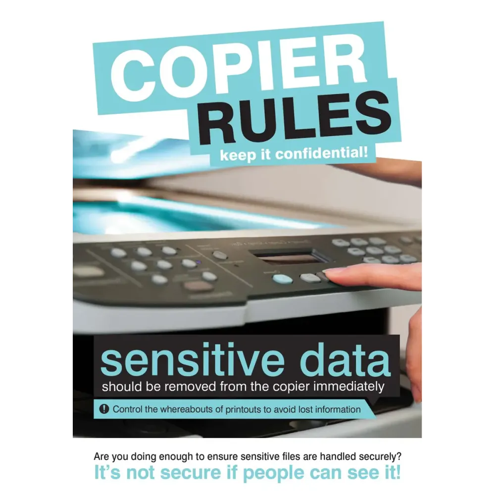 This poster has been designed to remind employees who deal with sensitive data to protect said data by following photocopier rules.