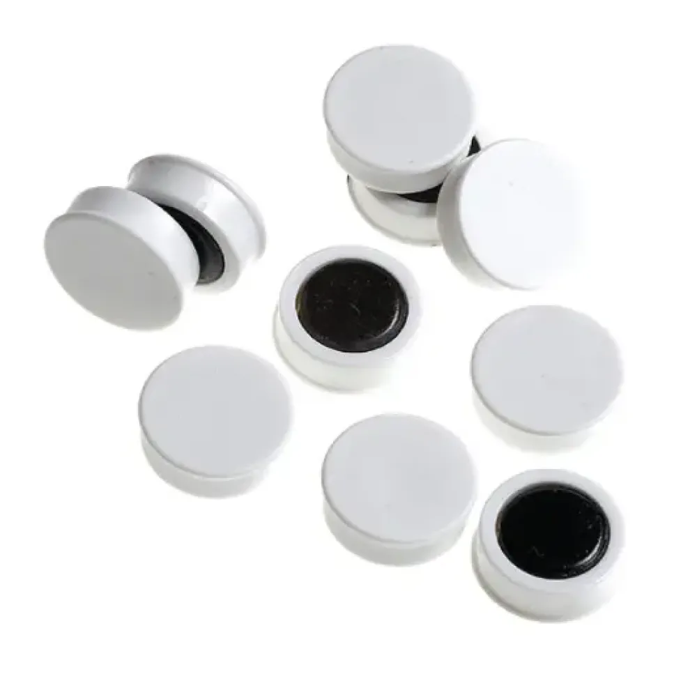 These 20mm circular magnets have a white plastic cover encasing the magnet
