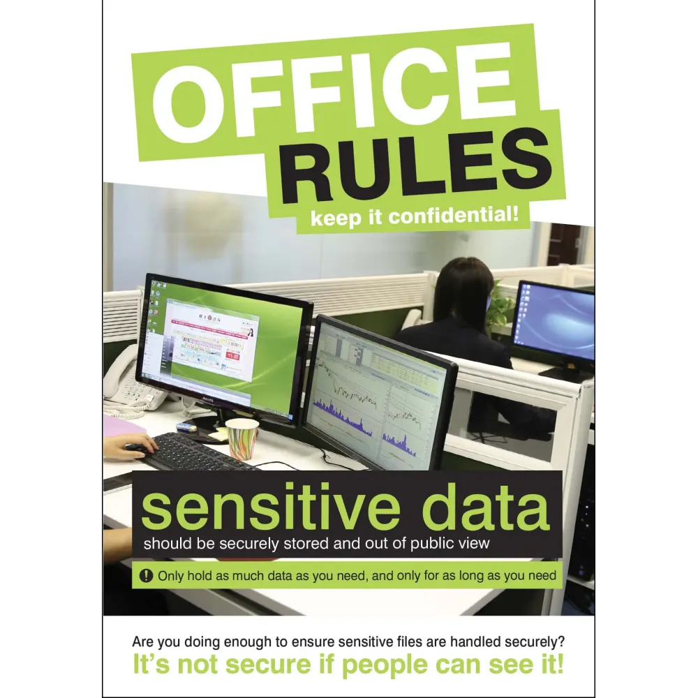 This poster has been designed to remind employees who deal with sensitive data to protect said data by following office rules.