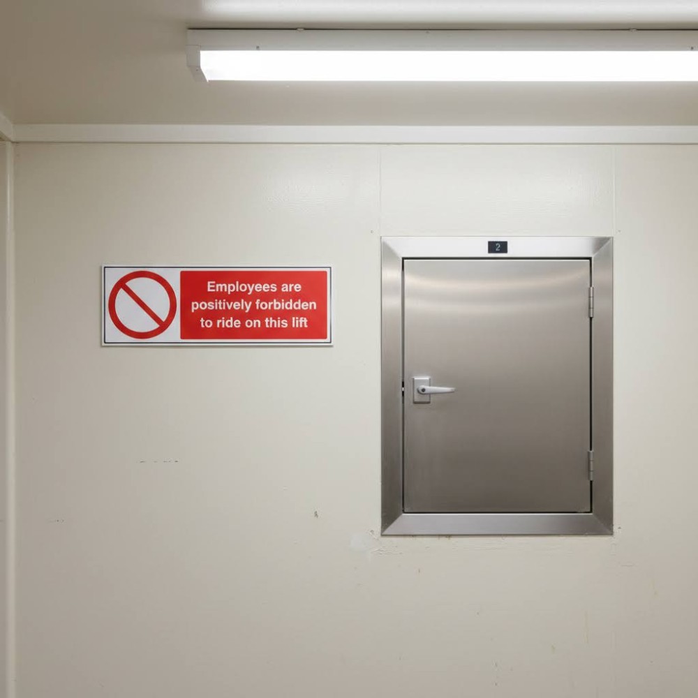 These signs are commonly found in warehouses, factories, construction sites, and any other industrial environments where lifts or forklifts are in use. By prominently displaying this warning, employers emphasise the importance of following safe operating procedures and discourage risky behaviour that could endanger employees or damage equipment.