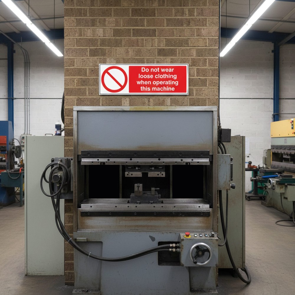Overall, the No Loose Clothing When Operating Machine sign plays a vital role in preventing accidents and protecting workers by encouraging safe behaviour around potentially dangerous equipment.