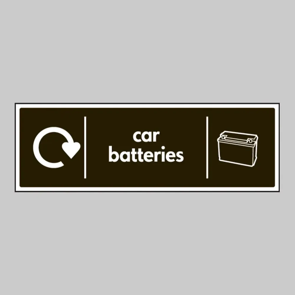 Proper recycling of car batteries helps recover valuable materials like lead and plastic, conserves natural resources, and complies with environmental regulations. The sign supports WRAP (Waste & Resources Action Programme) standards, assisting organisations in managing automotive waste responsibly and achieving sustainability goals.