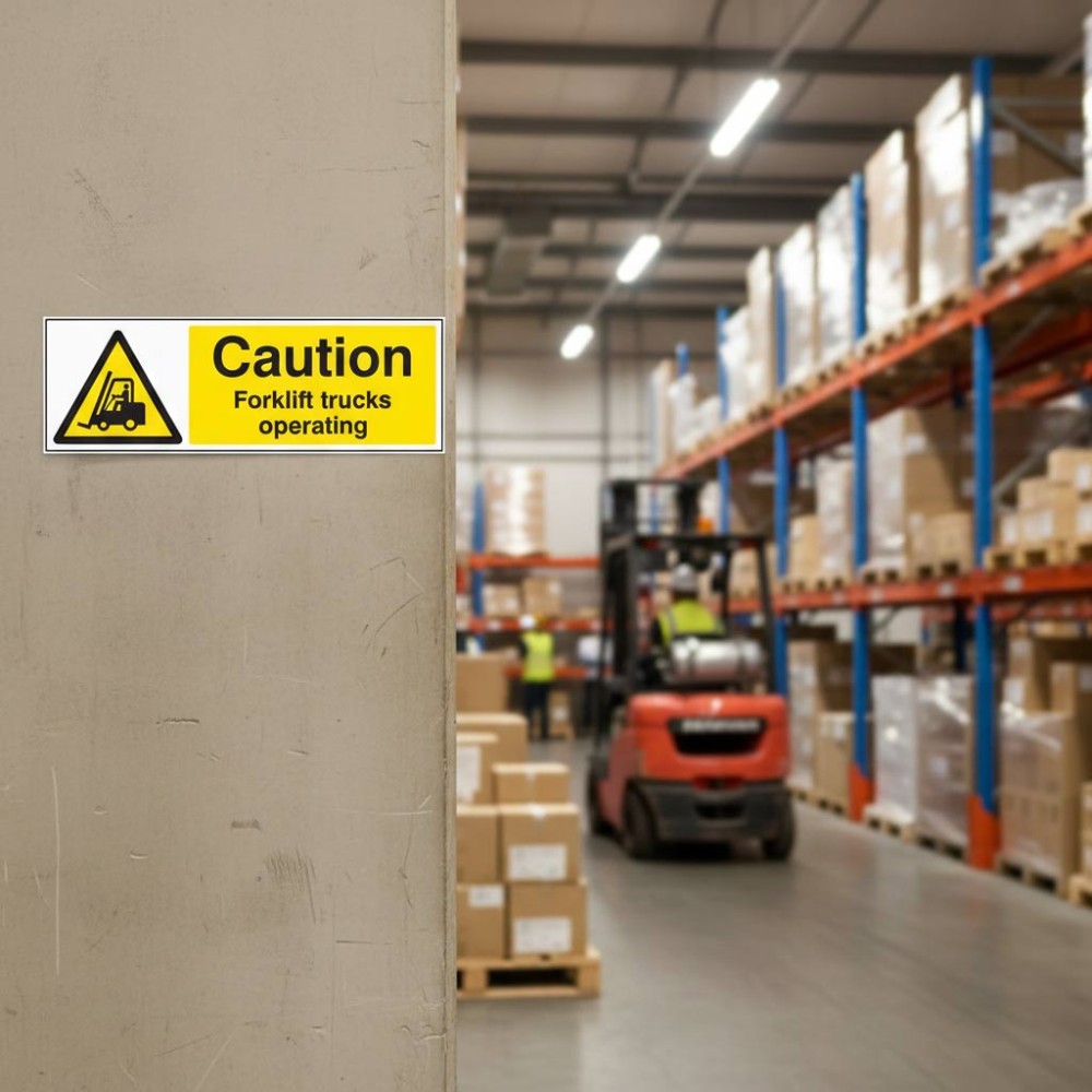 A crucial safety warning used to alert pedestrians and other workers that forklift trucks are actively operating in the area. Forklifts are heavy machinery that can move quickly and carry large loads, creating potential hazards such as collisions, crushing injuries, or accidents if people are unaware of their presence. This sign encourages heightened awareness and careful behaviour to prevent injuries.