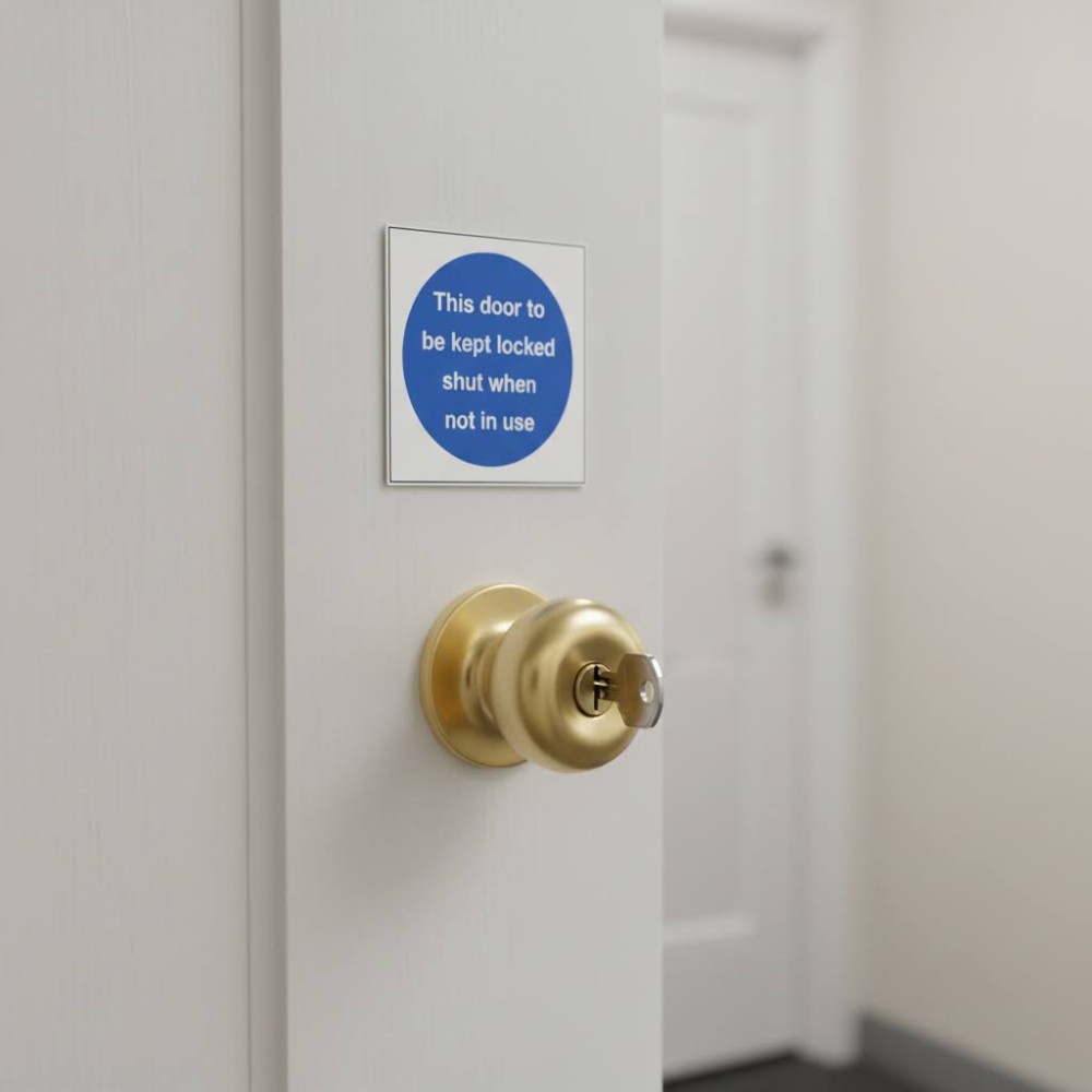 " This Door to be Kept Locked Shut When Not in Use" signs are important because they help maintain security and safety by ensuring certain doors remain closed and locked when they are not actively being used. This is especially crucial for doors that lead to hazardous areas, restricted zones, or places where unauthorised access could pose safety risks, such as plant rooms, storage areas with dangerous materials, or fire-rated doors designed to prevent the spread of fire and smoke.
