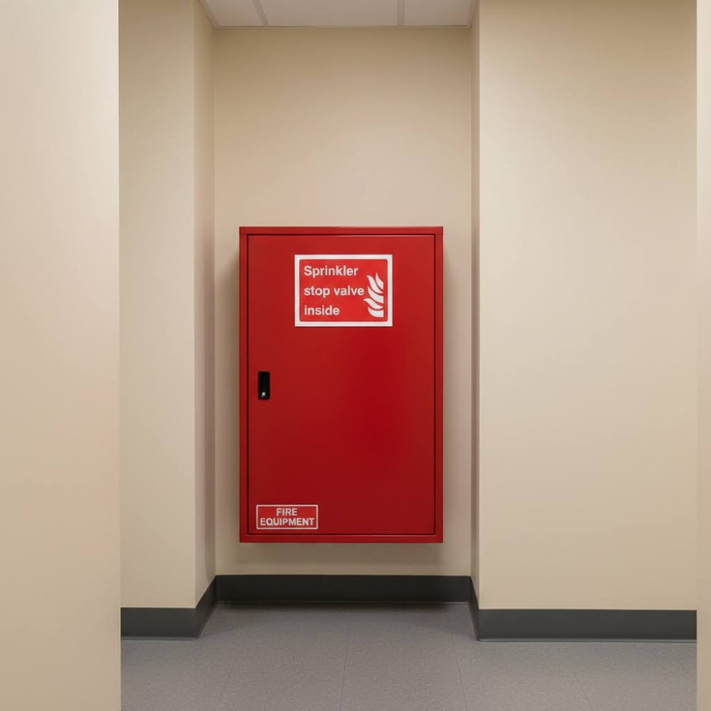 Placement of the sign is essential for visibility and effectiveness. It should be installed directly on the door of the room or enclosure housing the sprinkler stop valve, or immediately above the valve itself, at eye level, and in a location free from obstructions. In large or complex buildings, additional directional signs may be used to guide personnel from main access points to the valve. For enhanced visibility in low-light or emergency conditions, photoluminescent or reflective signage is recommended.