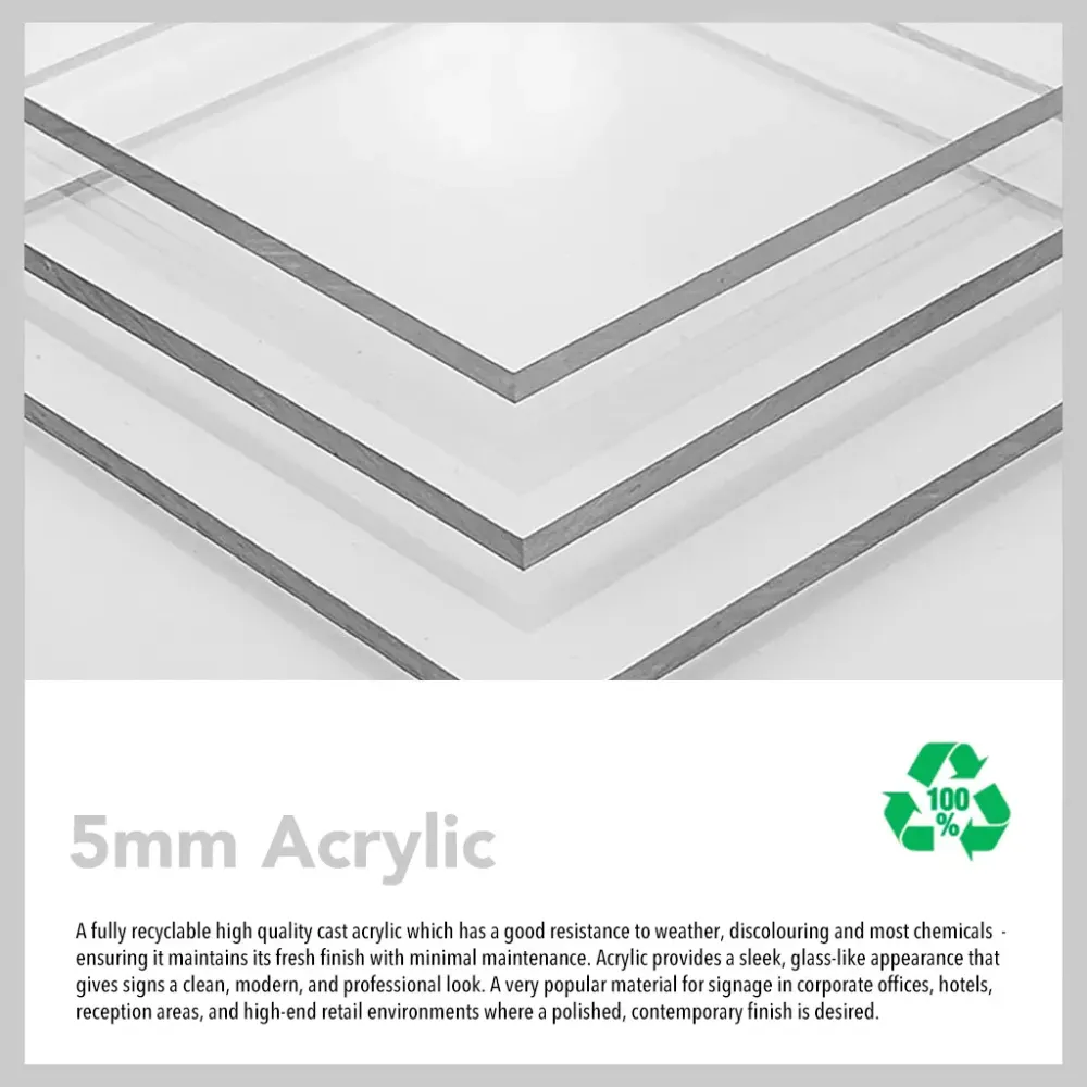 Acrylic with Anodised Aluminium Stand-offs:A fully recyclable high quality cast acrylic which has a good resistance to weather, discolouring and most chemicals - ensuring it maintains it - finish with minimal maintenance. Acrylic provides a sleek, glass-like appearance that gives signs a clean, modern, and professional look whilst the anodised aluminium stand-offs create a floating effect by holding the sign slightly away from the wall, adding depth and visual interest. This combination is very popular in corporate offices, hotels, reception areas, and high-end retail environments where a polished, contemporary finish is desired.
