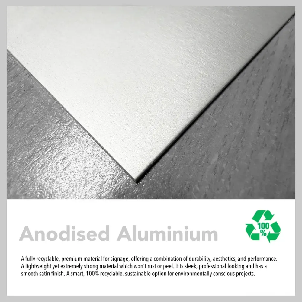 Anodised Aluminium: A fully recyclable, premium material for signage, offering a combination of durability, aesthetics, and performance. A lightweight yet extremely strong material which won't rust or peel. It is sleek, professional looking and has a smooth satin finish. A smart, 100% recyclable, sustainable option for environmentally conscious projects.