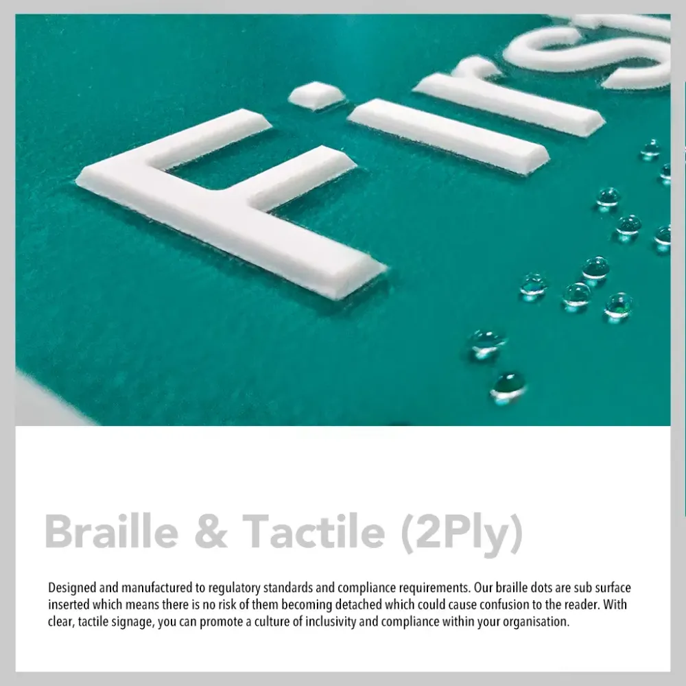 Braille: Manufactured from durable 1.5mm 2-ply PVC with a variety of professional two-tone finishes. 2-ply PVC can be printed onto or the surface layer can be engraved to reveal a second colour beneath. Additionally, it is naturally resistant to moisture, UV rays, and many chemicals. A cost-effective, low-maintenance, and highly customisable option for facilities that need tough, legible, and long-lasting signage.