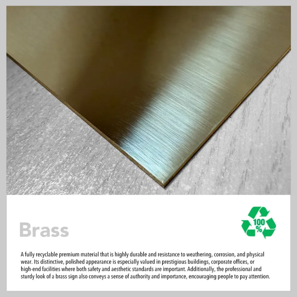 Brass:A fully recyclable premium material that is highly durable and resistance to weathering, corrosion, and physical wear. Its distinctive, polished appearance is especially valued in prestigious buildings, corporate offices, or high-end facilities where both safety and aesthetic standards are important. Additionally, the professional and sturdy look of a brass sign also conveys a sense of authority and importance, encouraging people to pay attention.