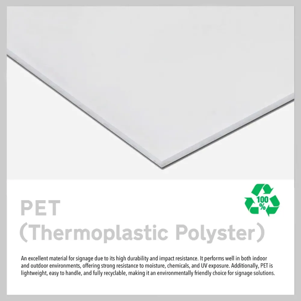 2mm PET: An excellent material for signage due to its high durability, impact resistance, and optical clarity. It performs well in both indoor and outdoor environments, offering strong resistance to moisture, chemicals, and UV exposure. This makes it ideal for high-traffic areas or locations where hygiene and visibility are crucial. Additionally, PET is lightweight, easy to handle, and fully recyclable, making it an environmentally friendly choice for modern signage solutions.