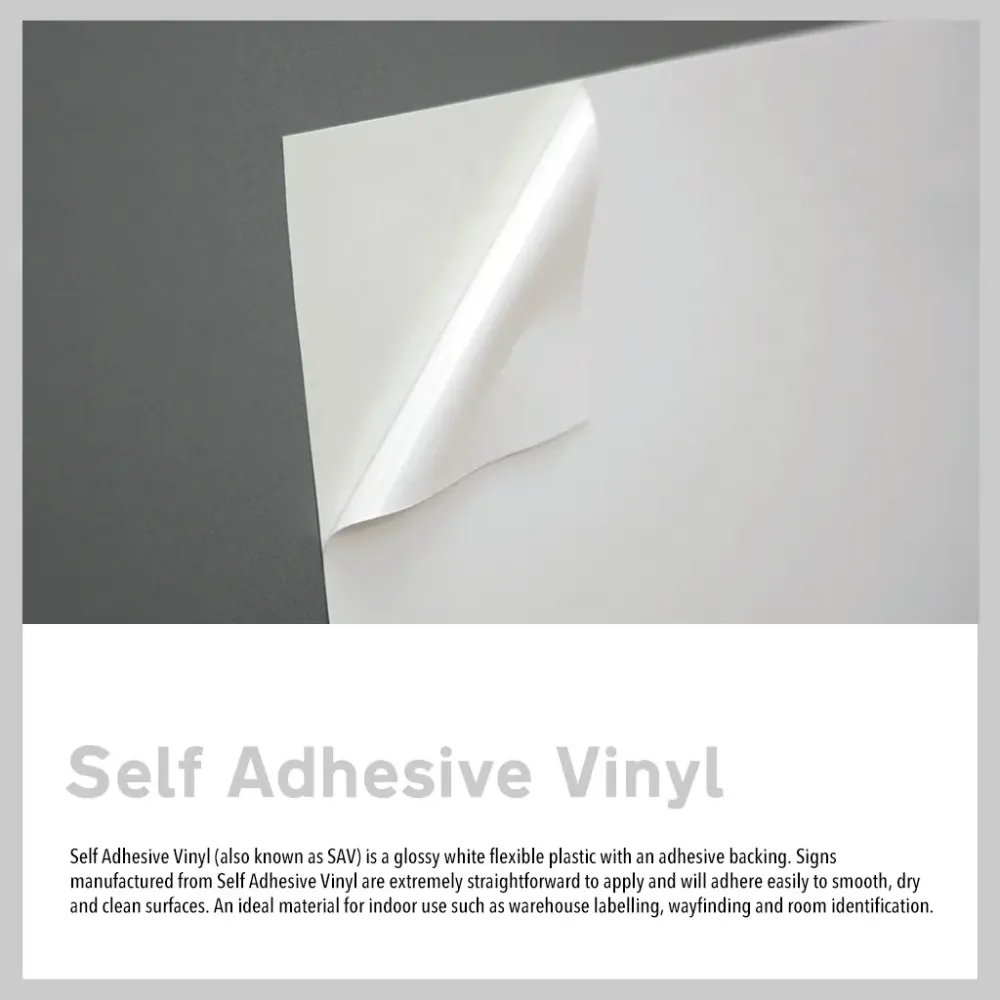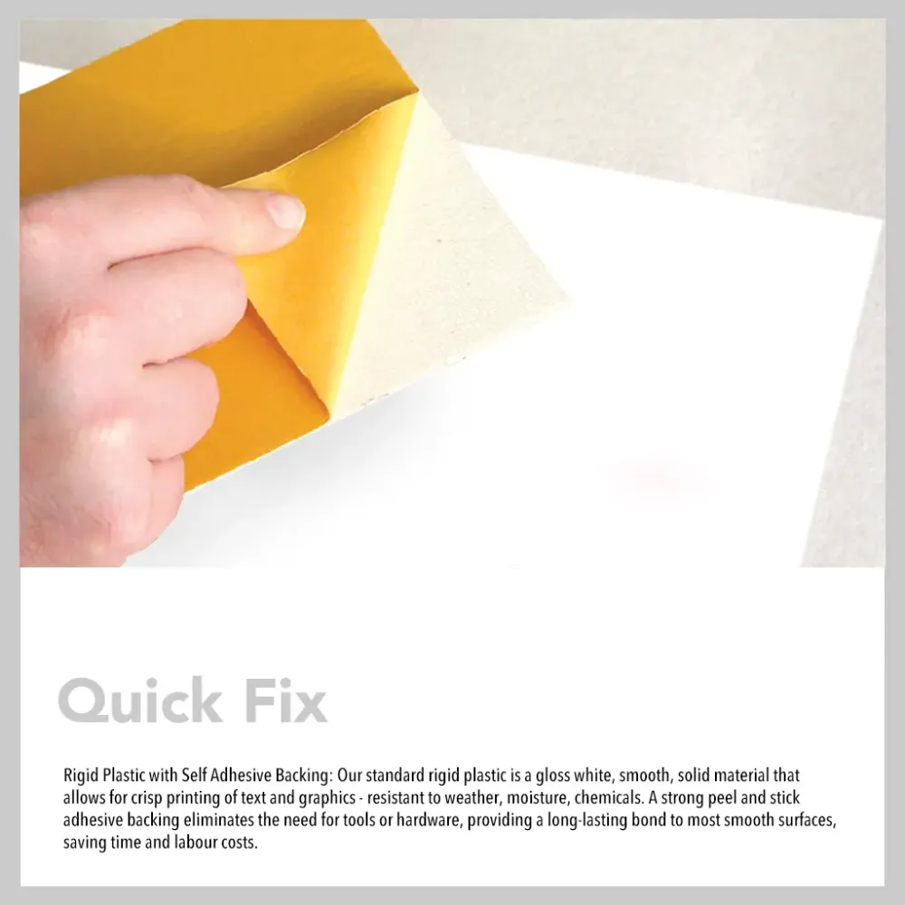 Rigid Plastic with Self Adhesive Backing: Our standard rigid plastic is a gloss white, smooth, solid material that allows for crisp printing of text and graphics - resistant to weather, moisture, chemicals. A strong peel & stick adhesive backing eliminates the need for tools or hardware, providing a long-lasting bond to most smooth surfaces, saving time and labour costs.