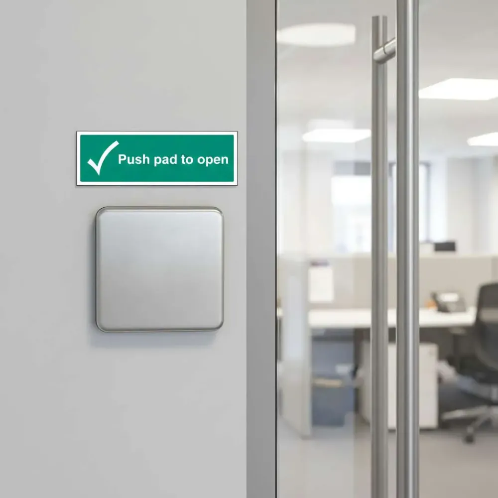 The purpose of the Push Pad to Open sign is to reduce confusion during critical moments by giving straightforward, easy-to-follow instructions. In stressful emergencies such as fires or power failures, clear signage enables faster action, allowing people to exit safely without hesitation.