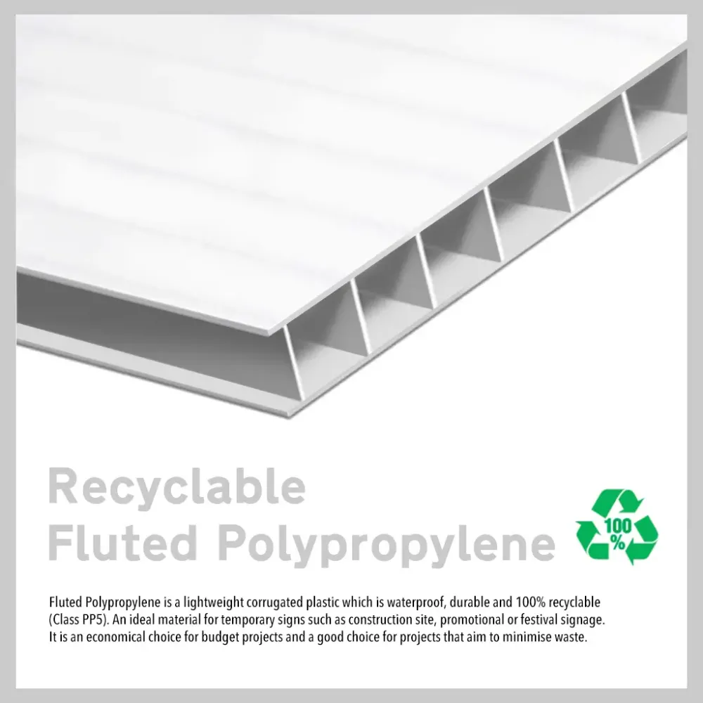 Choosing recyclable fluted polypropylene as the material for this sign offers practical advantages. It is lightweight, making it easy to transport and install, yet durable enough to withstand outdoor conditions such as rain, wind, and sunlight. Being recyclable also supports environmental sustainability, allowing companies to minimise waste and demonstrate their commitment to eco-friendly practices.