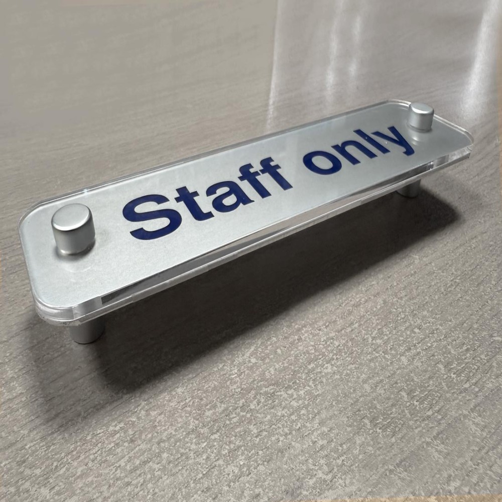 Anodised Aluminium with 5mm Clear Acrylic Face:Anodised aluminium provides a tough, corrosion-resistant base that withstands scratches, impacts, and environmental wear whilst the clear acrylic face adds a smooth, glossy finish that both enhances the sign is visual depth and sophistication whilst also protecting printed graphics from fading, scratching, and dirt. This helps maintain sharpness, colour vibrancy, and legibility over time, even in high-traffic areas.. This makes it ideal for long-lasting signs in both indoor and outdoor settings. The anodised aluminium stand-offs create a floating effect by holding the sign slightly away from the wall, adding depth and visual interest. This combination is very popular in corporate offices, hotels, reception areas, and high-end retail environments where a polished, contemporary finish is desired.