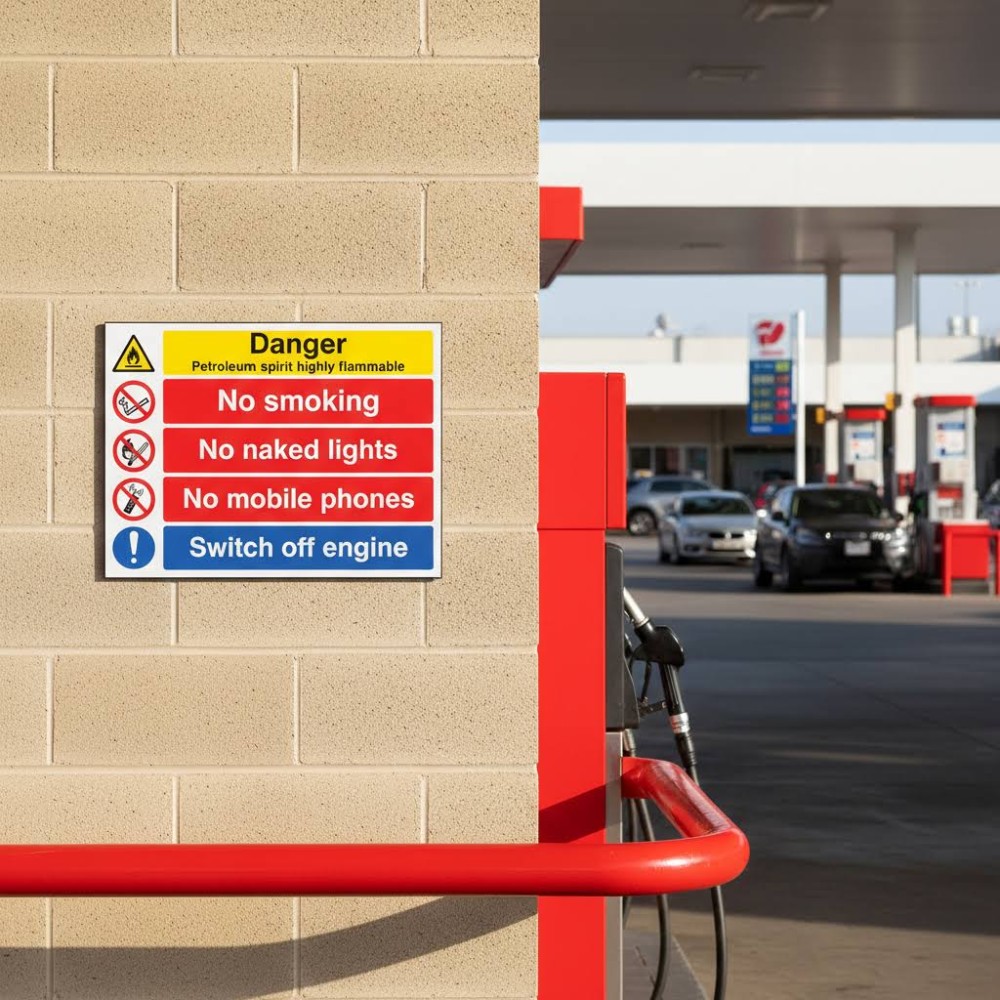 This sign is commonly used in fuel stations, chemical storage facilities, industrial plants, and transport depots where petroleum or other highly flammable liquids are present. Placing the sign at entrances, dispensing areas, and storage points ensures that personnel and visitors follow strict safety protocols.