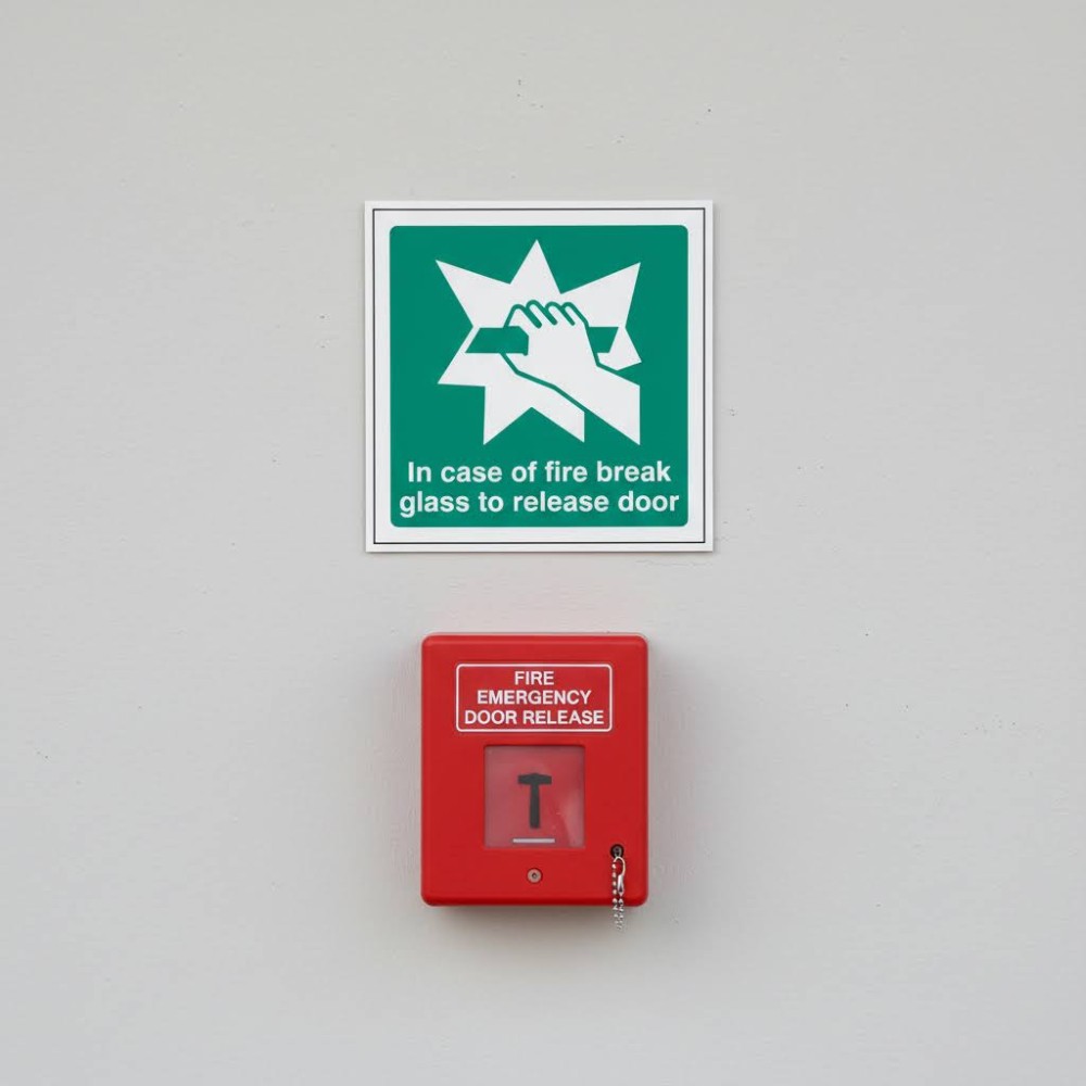 You'll typically find this sign near emergency doors in buildings such as offices, hospitals, schools, factories, and public facilities. It is placed directly on or adjacent to the door, close to the glass break panel or emergency release unit, ensuring it is visible and easy to understand in urgent situations.