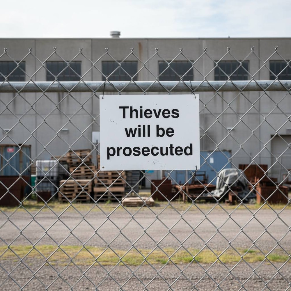 A "Thieves Will Be Prosecuted" sign serves as a strong warning and legal notice that theft will not be tolerated and will result in criminal action. Its primary purpose is deterrence - to discourage potential thieves from committing crimes by making it clear that security measures are in place and that legal consequences will follow if theft occurs. The sign reinforces a zero-tolerance policy and sets expectations for lawful behaviour.